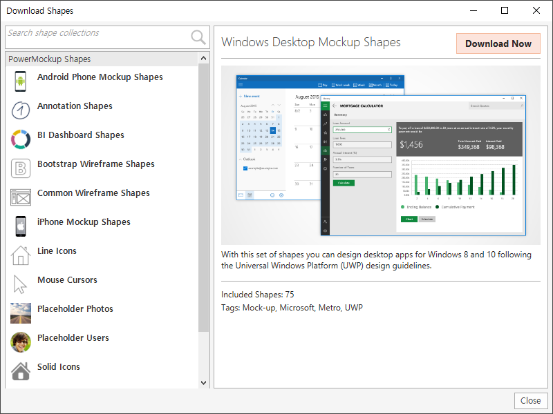 Bootstrap, Android 등의 개발을 위한 목업 제작을 위해 Shapes를 추가로 다운로드할 수 있다.